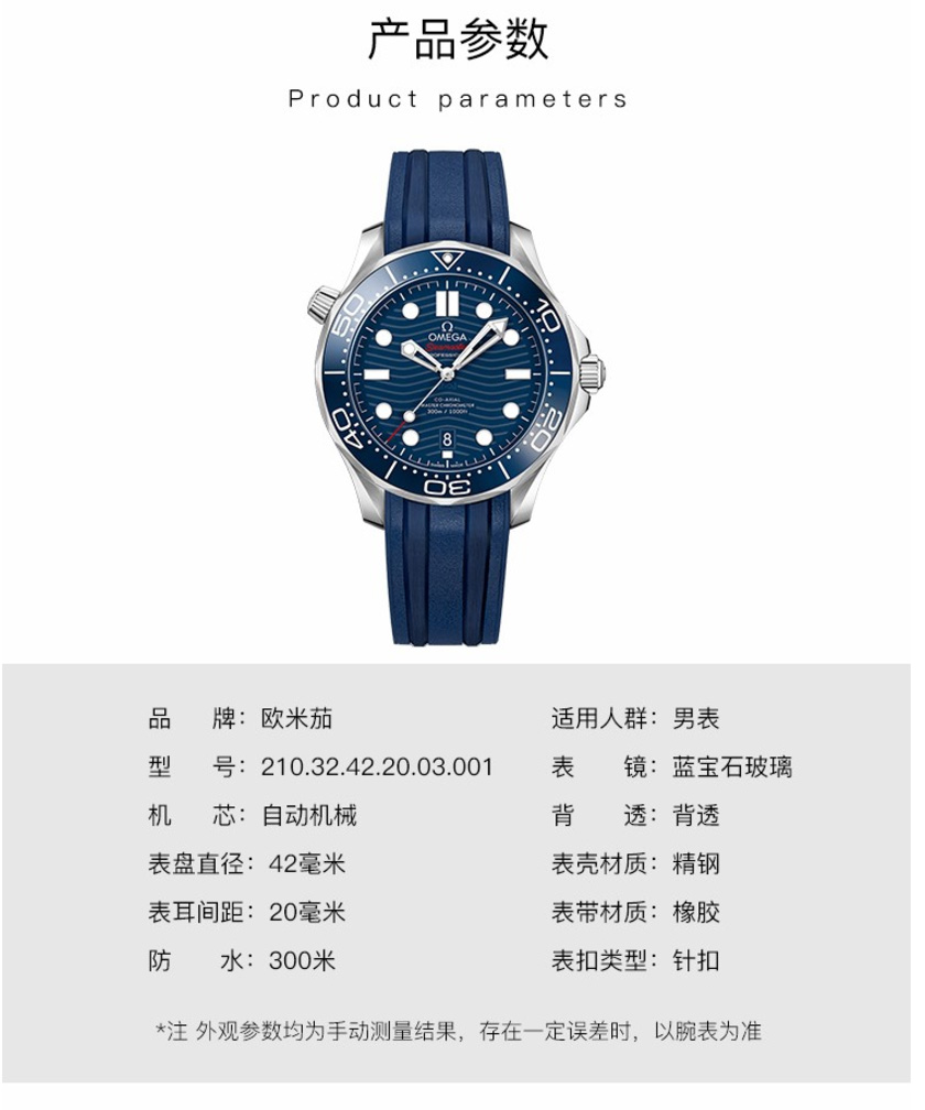 显示方式: 指针式 手表种类: 男表冠 类型: 旋入式 表底类型: 透底防水深度: 300m
